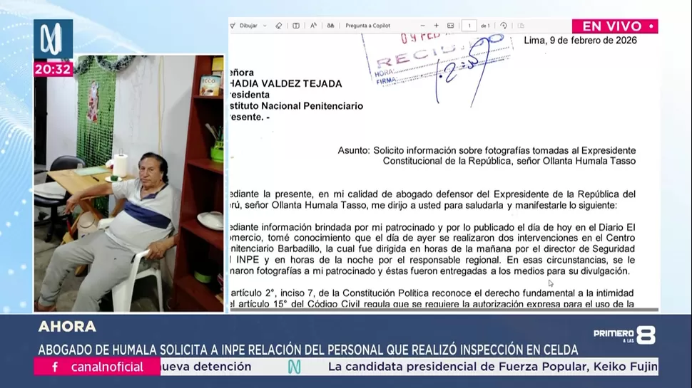 El documento, fechado el 9 de febrero de 2026, fue dirigido a la presidenta del INPE, Shadia Valdez Tejada. En la misiva, la defensa señala que, según información brindada por su patrocinado y por una publicación del Diario El Comercio, se realizaron dos intervenciones en el penal, una en horas de la mañana y otra por la noche, durante las cuales se tomaron fotografías.