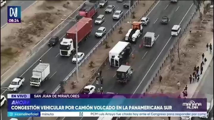 Un camión accidentado a la altura del kilómetro 16 de la Panamericana Sur provocó el cierre parcial de la vía. El tránsito en San Juan de Miraflores se encuentra restringido.