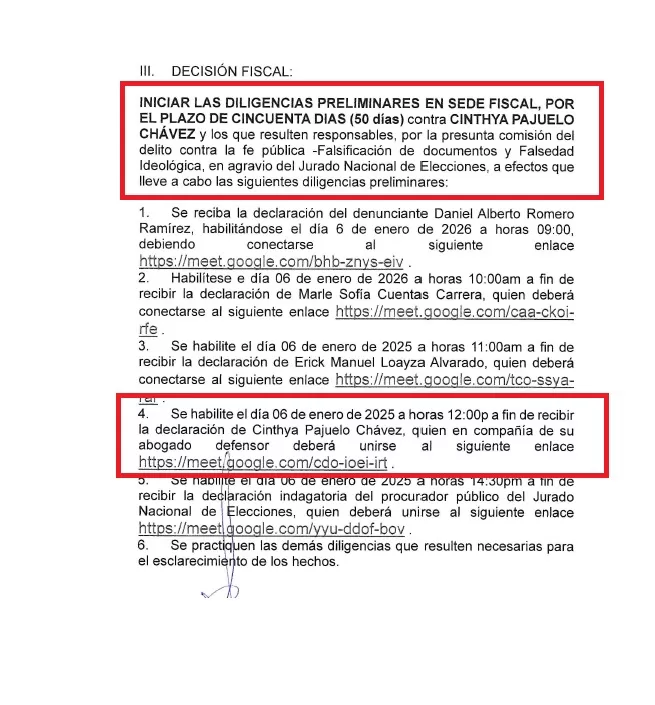 Como parte del plan de investigación, la Fiscalía ha citado a declarar a los tres denunciantes, a la imputada y al procurador del Jurado Nacional de Elecciones. Todas las diligencias han sido fijadas para el 6 de enero de 2026 en horarios consecutivos, a excepción de una cita que, por error material, figura con fecha de 2025.