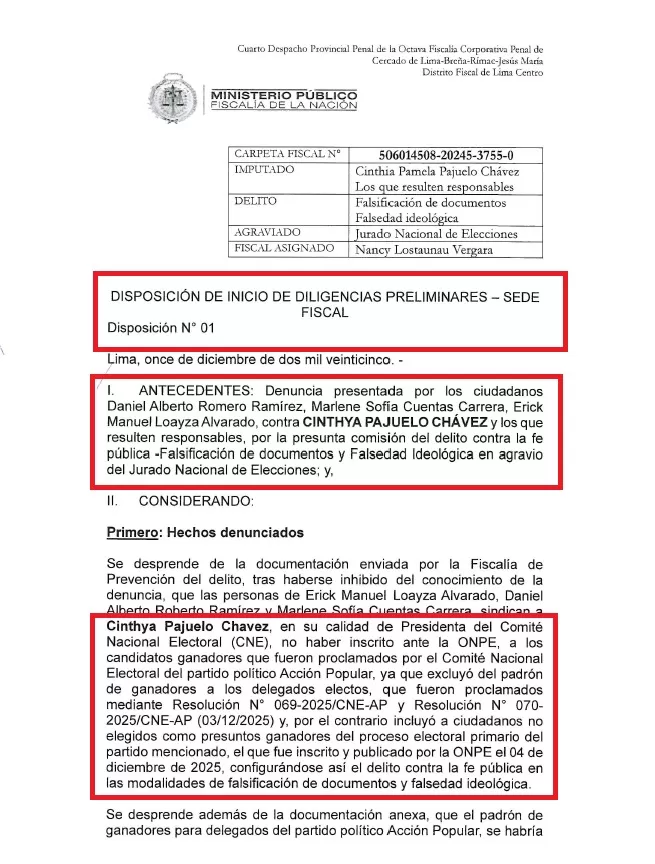 La Fiscalía abrió diligencias preliminares contra Cinthya Pajuelo, expresidenta del Comité Electoral de Acción Popular, por presunto fraude en las elecciones internas del partido. Se investiga la alteración del padrón de delegados proclamados, lo cual habría permitido la participación de personas no elegidas en la votación interna del 7 de diciembre de 2025. El caso motivó la nulidad del proceso por parte del JNE, que excluyó al partido de las elecciones 2026. La investigación tendrá un plazo de 50 días. La imputada y los denunciantes deberán declarar en enero de 2026 como parte de las diligencias fiscales programadas.