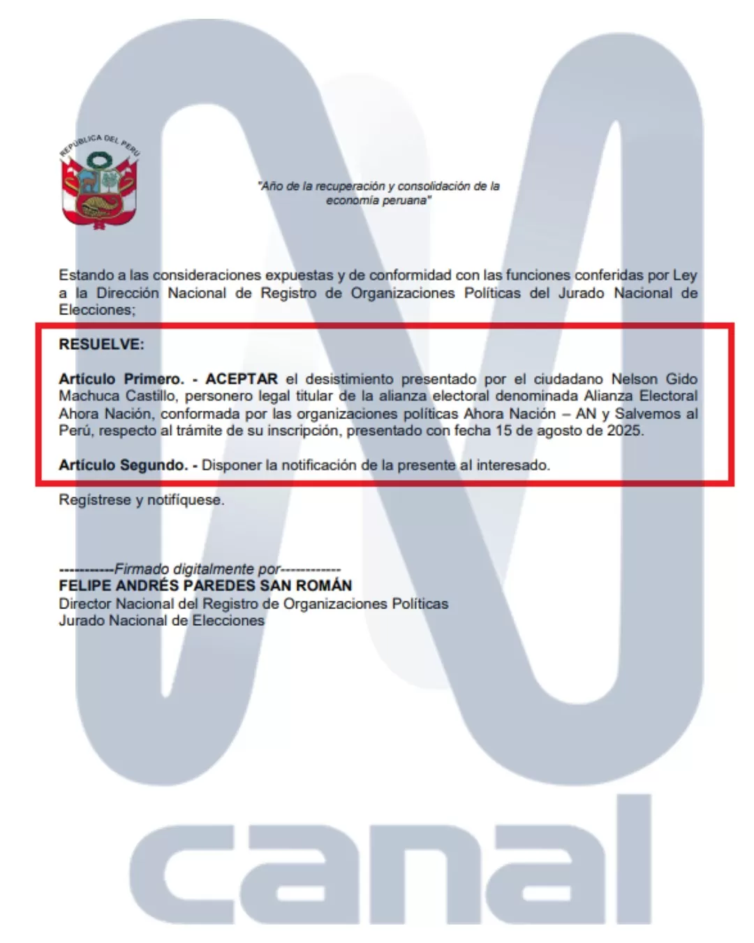El JNE aceptó el desistimiento de la inscripción de la alianza electoral “Ahora Nación”, conformada por Ahora Nación – AN y Salvemos al Perú, tras solicitud formal de su personero legal. La decisión, sustentada en el marco legal vigente, concluye el trámite iniciado el 5 de agosto de 2025 y deja a ambas organizaciones fuera de una candidatura conjunta para las elecciones 2026.