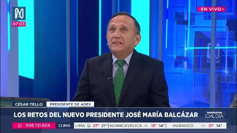El presidente de Adex, César Tello, se pronunció tras la elección de José Balcázar como presidente del Perú y señaló que la situación cambió radicalmente respecto a lo previsto inicialmente. Indicó que tenía previsto acudir a felicitar al nuevo mandatario y expresar qué aspectos debían continuar y cuáles no en la gestión.