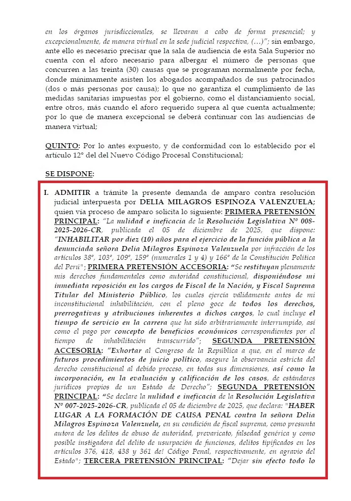 El Poder Judicial admitió a trámite una demanda de amparo interpuesta por Delia Espinoza contra el Congreso de la República, en la que solicita anular su inhabilitación por diez años y revertir la causa penal en su contra. La acción plantea también su reposición como fiscal de la Nación y fiscal suprema titular, además del pago de beneficios no percibidos. La audiencia única fue fijada para el 9 de marzo de 2026. Las resoluciones legislativas que motivaron la demanda fueron aprobadas el 3 de diciembre de 2025, tras un proceso iniciado en 2024 por denuncias formuladas por varios congresistas.
