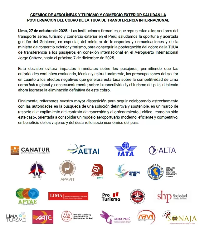 Los gremios que representan a los sectores de transporte aéreo, turismo y comercio exterior manifestaron su respaldo a la decisión del Gobierno y Lima Airport Partners (LAP) de postergar el cobro de la TUUA de transferencia internacional en el Aeropuerto Internacional Jorge Chávez. La medida fue extendida hasta el 7 de diciembre de 2025.