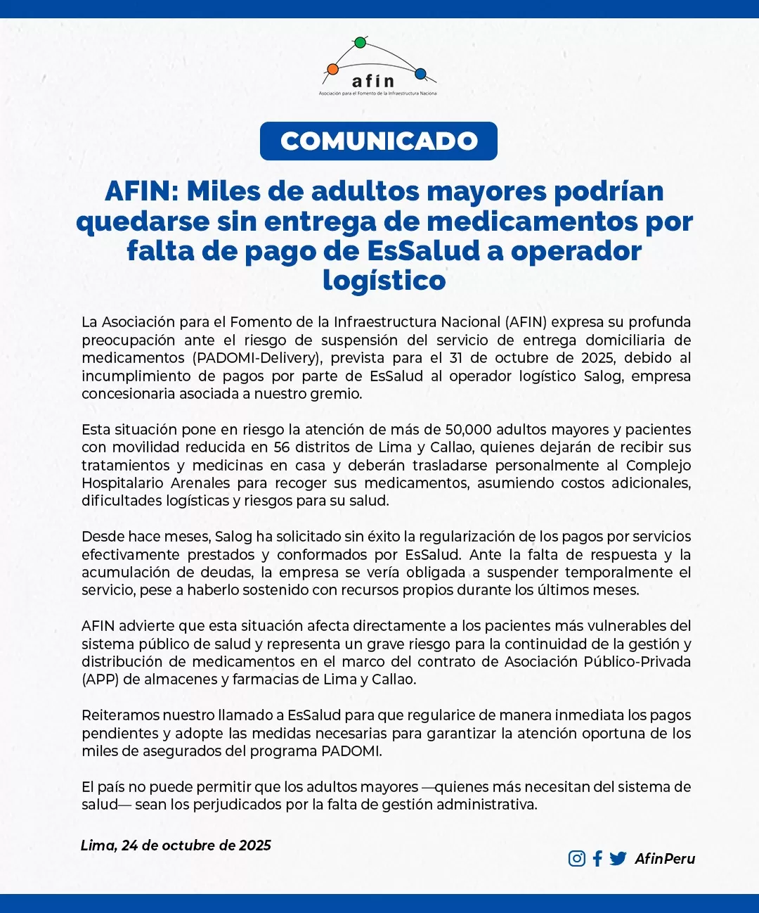 La Asociación para el Fomento de la Infraestructura Nacional (AFIN) advirtió que el servicio de entrega domiciliaria de medicamentos conocido como Padomi-Delivery podría ser suspendido a partir del 31 de octubre de 2025. Esta medida afectaría directamente a más de 50,000 adultos mayores y personas con movilidad reducida en Lima y Callao. La advertencia fue emitida a través de un comunicado oficial.