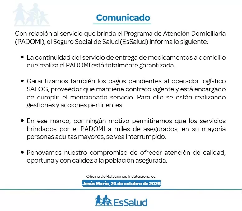 Por su parte, EsSalud aseguró que el servicio de entrega de medicamentos a domicilio del programa PADOMI continuará con normalidad, pese a los recientes cuestionamientos de la Asociación para el Fomento de la Infraestructura Nacional (AFIN). La institución informó que el operador logístico SALOG mantiene contrato vigente y que los pagos pendientes están siendo regularizados mediante las gestiones correspondientes.