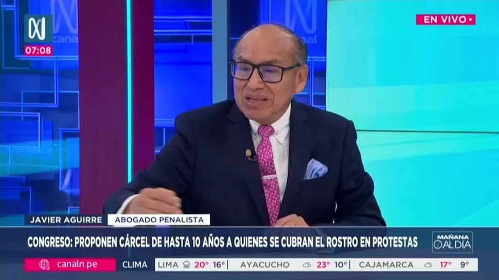 En diálogo con canal N, el abogado penalista Javier Aguirre, dijo que actualmente la legislación peruana permite que las personas se reúnan pacíficamente sin portar armas, incluso si llevan el rostro cubierto.