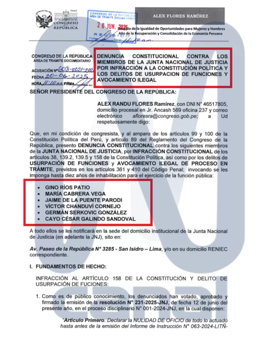 El congresista Alex Flores presentó una denuncia constitucional contra seis miembros de la Junta Nacional de Justicia (JNJ) por ordenar la reposición de Patricia Benavides como fiscal de la Nación. Se les acusa de infracción constitucional, usurpación de funciones y avocamiento ilegal, y se solicita su inhabilitación por diez años para ejercer cargos públicos.