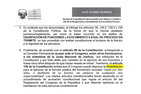La denuncia se sustenta en los artículos 99 y 100 de la Constitución, y en el artículo 89 del Reglamento del Congreso. También invoca el artículo 38 de la Carta Magna, que exige a los funcionarios públicos honrar y proteger los intereses del país.