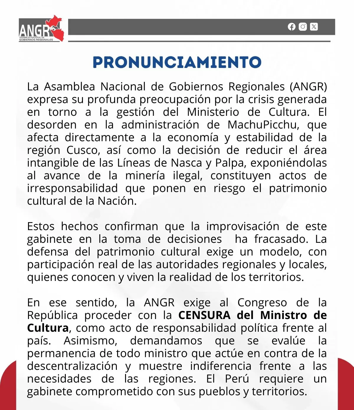 La ANGR exigió al Congreso que proceda con la censura política del ministro de Cultura, Fabricio Valencia. En su comunicado, criticó su gestión en Machu Picchu, la reducción del área intangible de las Líneas de Nasca y decisiones que, a su juicio, ponen en riesgo el patrimonio cultural. El organismo regional advirtió que evaluará la permanencia de ministros que ignoraren la descentralización. La moción parlamentaria contra Valencia incluye acusaciones por manejo irregular del patrimonio, contratos cuestionados y respuestas insatisfactorias ante el Congreso.