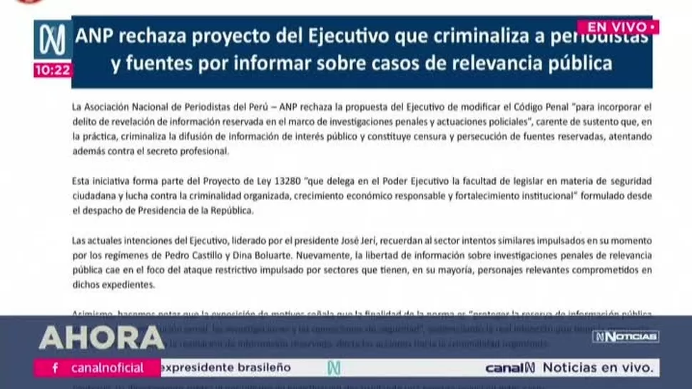 La Asociación Nacional de Periodistas del Perú (ANP) expresó su rechazo al proyecto presentado por el Ejecutivo que busca modificar el Código Penal para incorporar el delito de revelación de información reservada en investigaciones penales y actuaciones policiales.