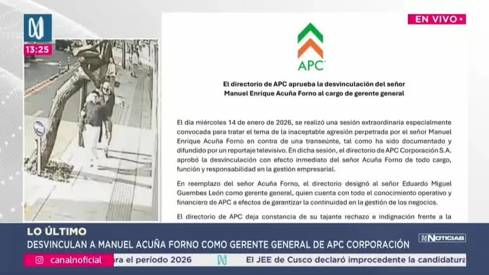 El directorio de APC Corporación S.A. anunció la desvinculación inmediata de Manuel Enrique Acuña Forno del cargo de gerente general, luego de que se difundiera un video en el programa Cuarto Poder donde se le ve agrediendo por la espalda a una transeúnte en Miraflores.