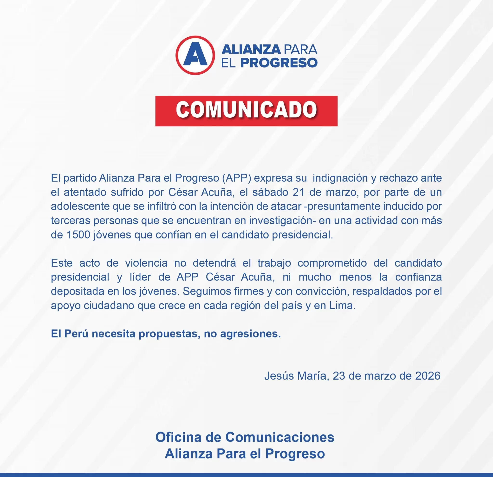 En su pronunciamiento, APP señaló que el agresor habría actuado inducido por terceras personas. El partido indicó que estas personas están siendo investigadas.