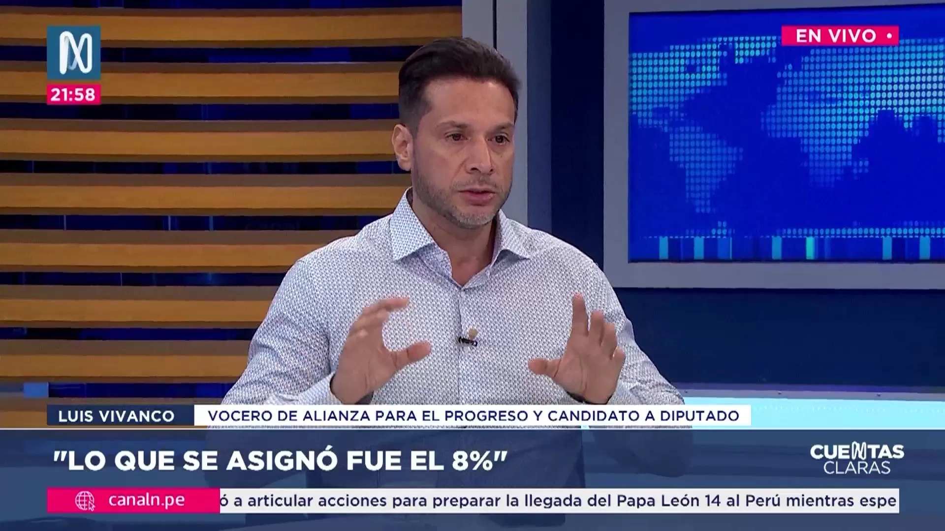 El vocero de Alianza para el Progreso (APP), Luis Vivanco, rechazó que su partido haya realizado un uso indebido del presupuesto de la franja electoral en favor de un canal de televisión vinculado a César Acuña. Las declaraciones se dieron durante una entrevista en el programa Cuentas Claras de Canal N.
