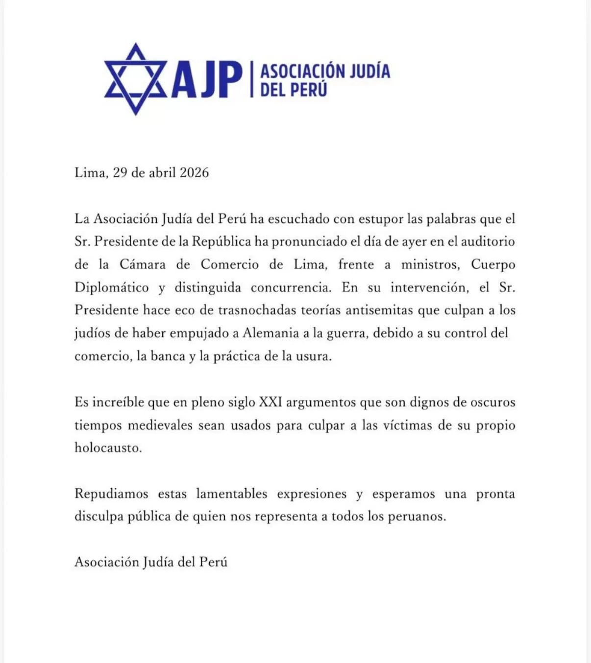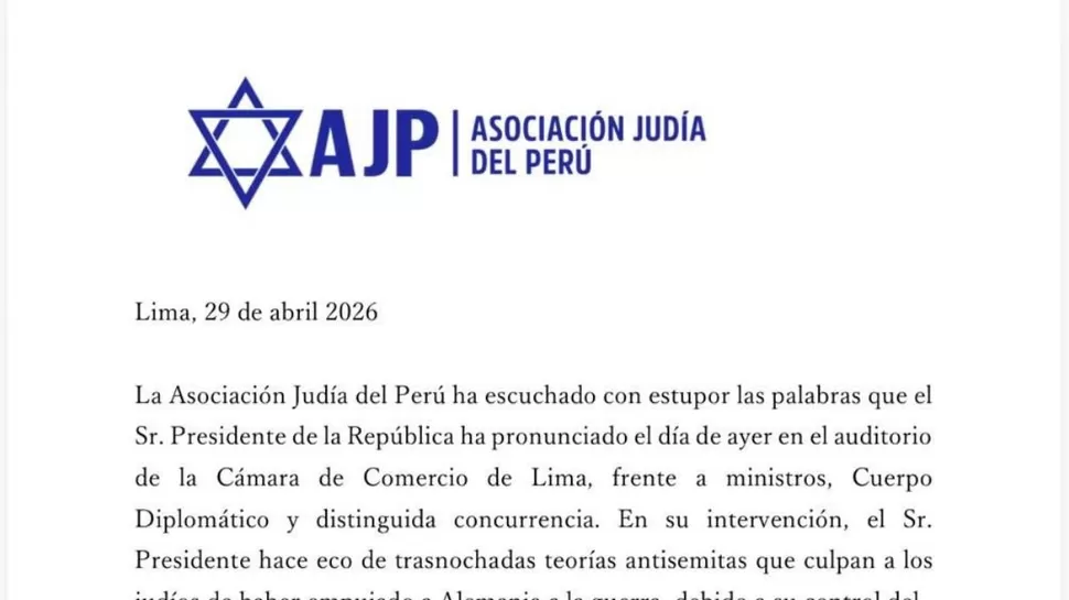 La Asociación Judía del Perú (AJP) emitió un comunicado oficial este 29 de abril de 2026 expresando su rechazo categórico ante las recientes declaraciones del Presidente de la República, Balcázar. Durante su intervención en el aniversario de la Cámara de Comercio de Lima (CCL), el mandatario sostuvo afirmaciones que vinculan a la comunidad judía con las causas del estallido de la guerra en Alemania.