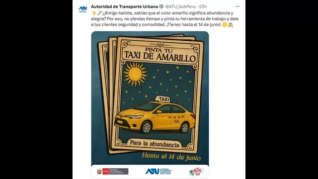 Esta disposición fue aprobada mediante la Resolución Directoral N.º 017-2022-ATU/DIR, que establece el amarillo como color oficial de identificación de los taxis independientes habilitados en Lima y Callao.