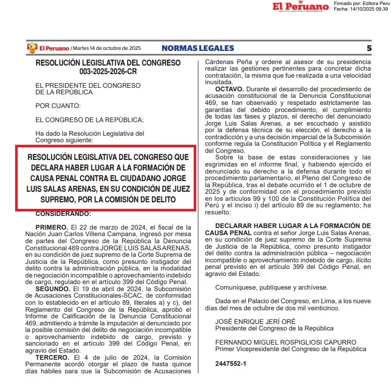La resolución que declara haber lugar a la formación de causa penal fue suscrita por el entonces presidente del Congreso, José Jerí, y por el primer vicepresidente, Fernando Rospigliosi. Con este acto, el Congreso autoriza formalmente al Ministerio Público a formular acusación penal contra Jorge Salas Arenas ante el Poder Judicial.