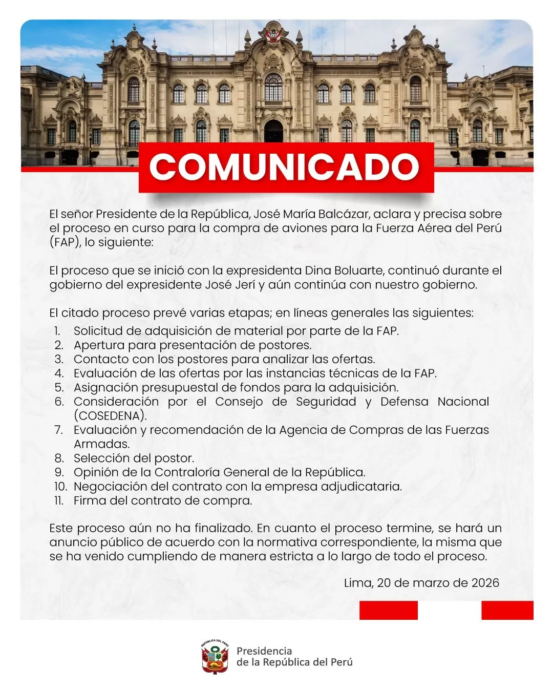 El presidente José María Balcázar afirmó que el proceso para la compra de aviones de combate para la Fuerza Aérea del Perú (FAP) continúa en ejecución y que se inició en gestiones anteriores. La precisión fue difundida mediante un comunicado oficial emitido el 20 de marzo de 2026.