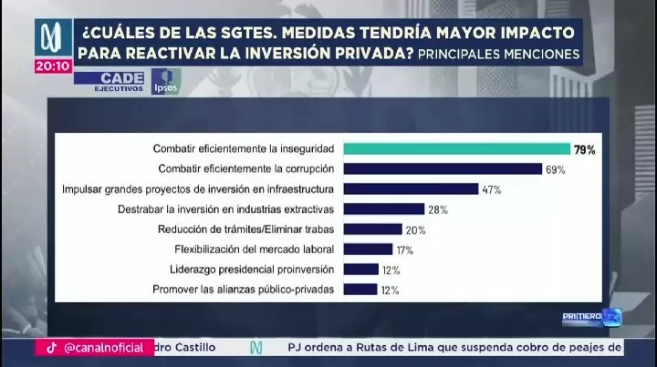 El 79% de empresarios encuestados considera que combatir eficientemente la inseguridad tendría el mayor impacto en la reactivación de la inversión privada. El resultado forma parte del estudio presentado por Ipsos Perú en Cade Ejecutivos 2025, elaborado a partir de una encuesta aplicada a 245 altos directivos de las 5 mil empresas más grandes del país entre el 17 y 29 de octubre.