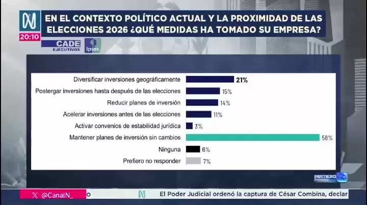 Al ser consultados sobre el impacto del contexto político actual y las elecciones de 2026, el 58% de los encuestados señaló que mantendrá sus planes de inversión privada sin cambios. El 21% indicó que ha optado por diversificar inversiones geográficamente, mientras que el 15% ha decidido postergar decisiones hasta después del proceso electoral.
