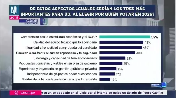 Ante la pregunta sobre los tres factores más importantes para elegir por quién votar en las elecciones presidenciales de 2026, el 55% de los ejecutivos priorizó el compromiso con la estabilidad económica y el rol del Banco Central de Reserva del Perú.