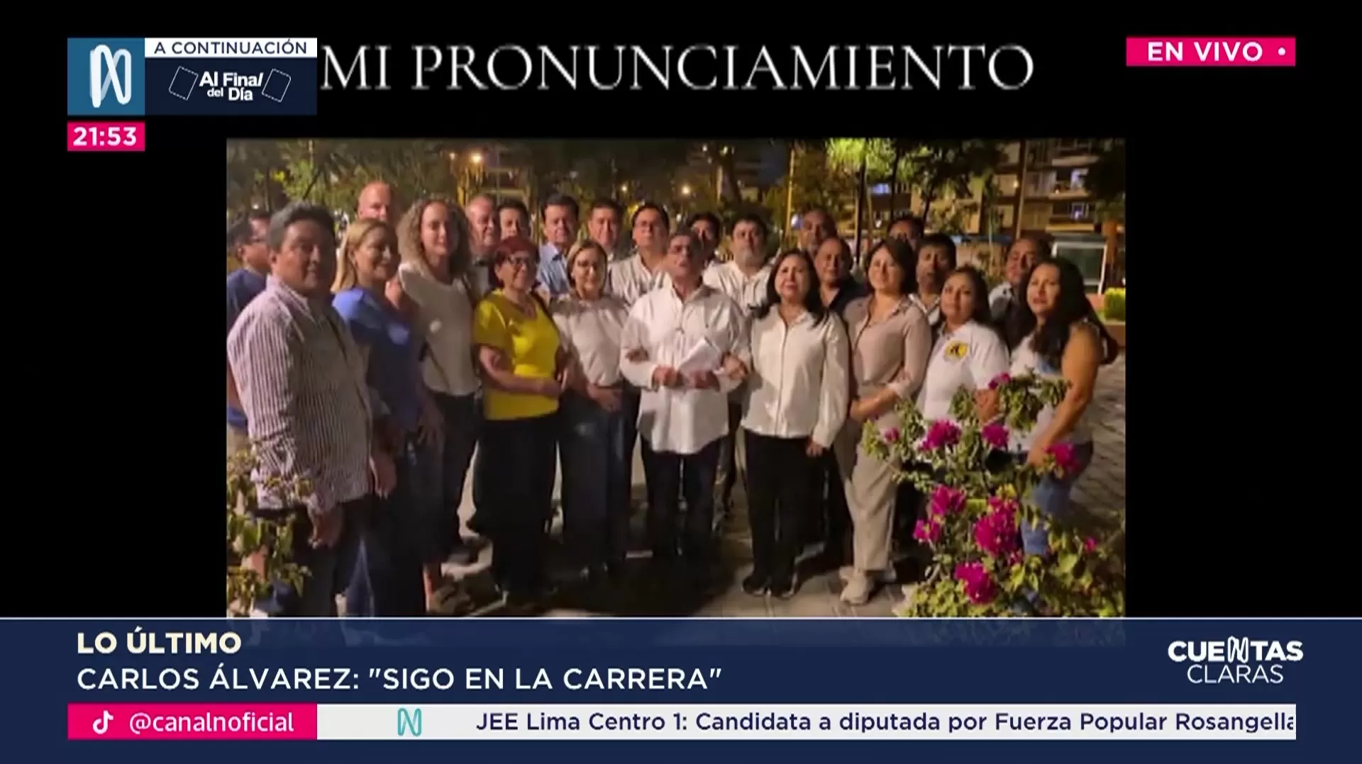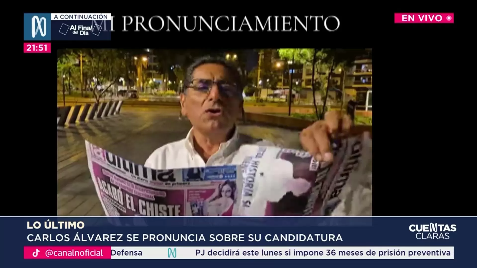 Carlos Álvarez anunció que continuará con su candidatura presidencial tras la polémica por el uso del presupuesto de la franja electoral por parte de su partido, País para Todos. En un video difundido en redes sociales, indicó que exigió sanciones para los responsables y la renuncia total al uso de la franja electoral como condición para seguir en carrera. Señaló que el partido reconoció el error, separó a los responsables y se allanará a las investigaciones del Ministerio Público. Álvarez afirmó que continuará en campaña y que presentará su plan de gobierno y equipo técnico.