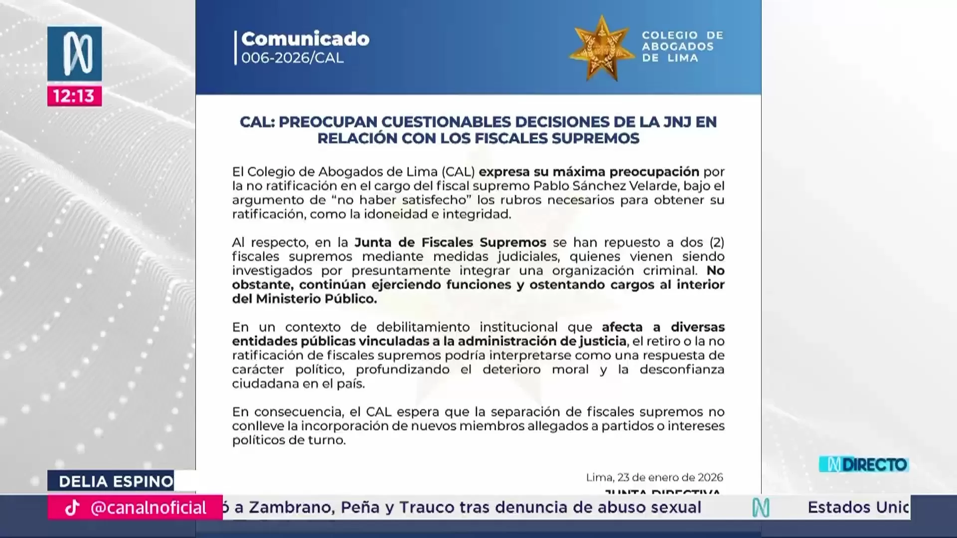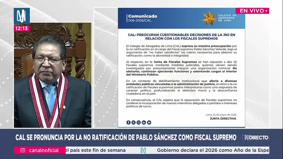 El Colegio de Abogados de Lima (CAL) expresó su preocupación ante la decisión de la Junta Nacional de Justicia (JNJ) de no ratificar en el cargo al fiscal supremo Pablo Sánchez. La institución señaló que la medida se adoptó bajo criterios de idoneidad e integridad, pese a que existen fiscales en funciones que enfrentan investigaciones por presunta vinculación a redes criminales.