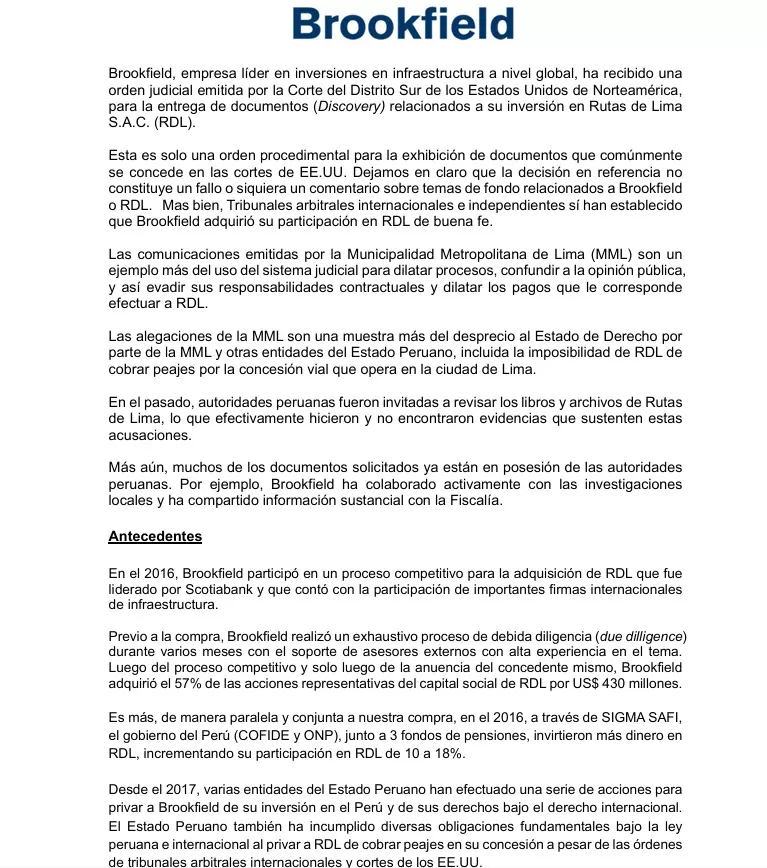 El comunicado también contiene duras críticas hacia la Municipalidad Metropolitana de Lima, a la que Brookfield acusa de utilizar el sistema judicial como mecanismo para evadir compromisos contractuales con la concesionaria Rutas de Lima.