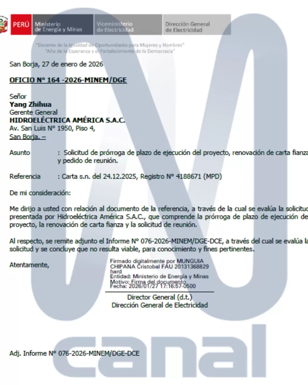 El Ministerio de Energía y Minas (Minem) rechazó formalmente la solicitud de la empresa Hidroeléctrica América S.A.C., presidida por Zhihua Yang, para prorrogar el inicio de un proyecto hidroeléctrico en Abancay, renovar su carta fianza y sostener una reunión con funcionarios del sector. Así lo confirmó el oficio N° 164-2026-MINEM/DGE emitido el 27 de enero de este año.