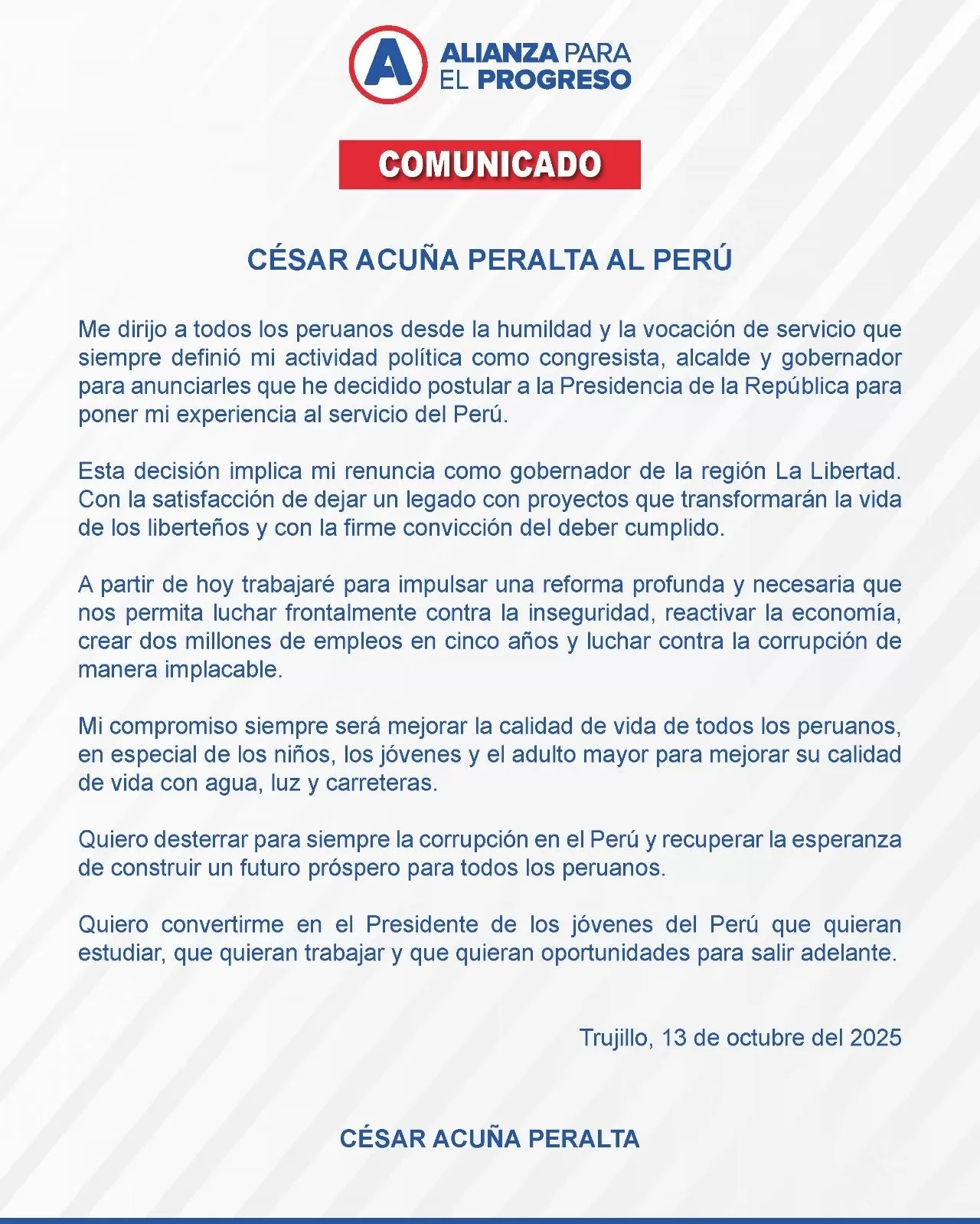 En un comunicado difundido por APP, Acuña señaló que su decisión obedece a una vocación de servicio construida a lo largo de su trayectoria como congresista, alcalde y gobernador.