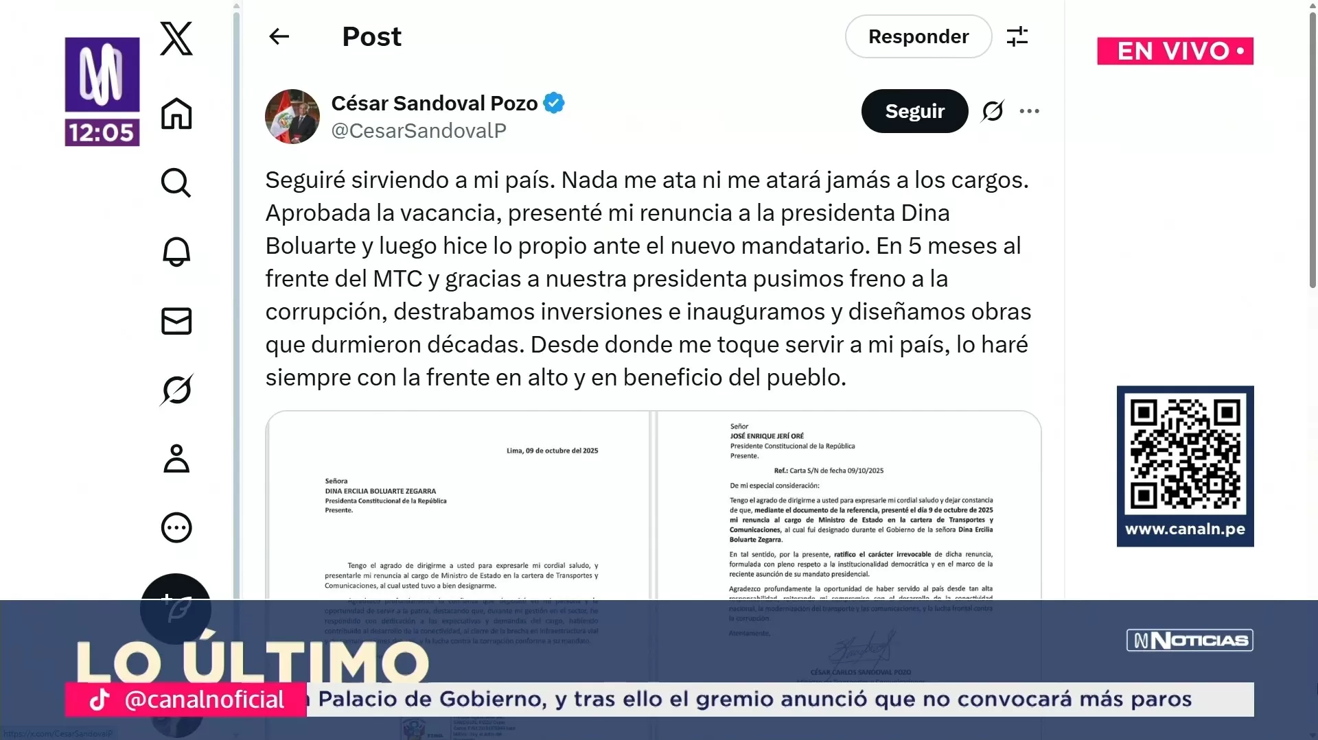 César Sandoval presentó su renuncia irrevocable al Ministerio de Transportes y Comunicaciones (MTC), tras la vacancia de Dina Boluarte. Mediante una carta dirigida a la exmandataria y otra al actual jefe de Estado, José Jeri, hizo oficial su decisión y agradeció la oportunidad de haber servido en el cargo.