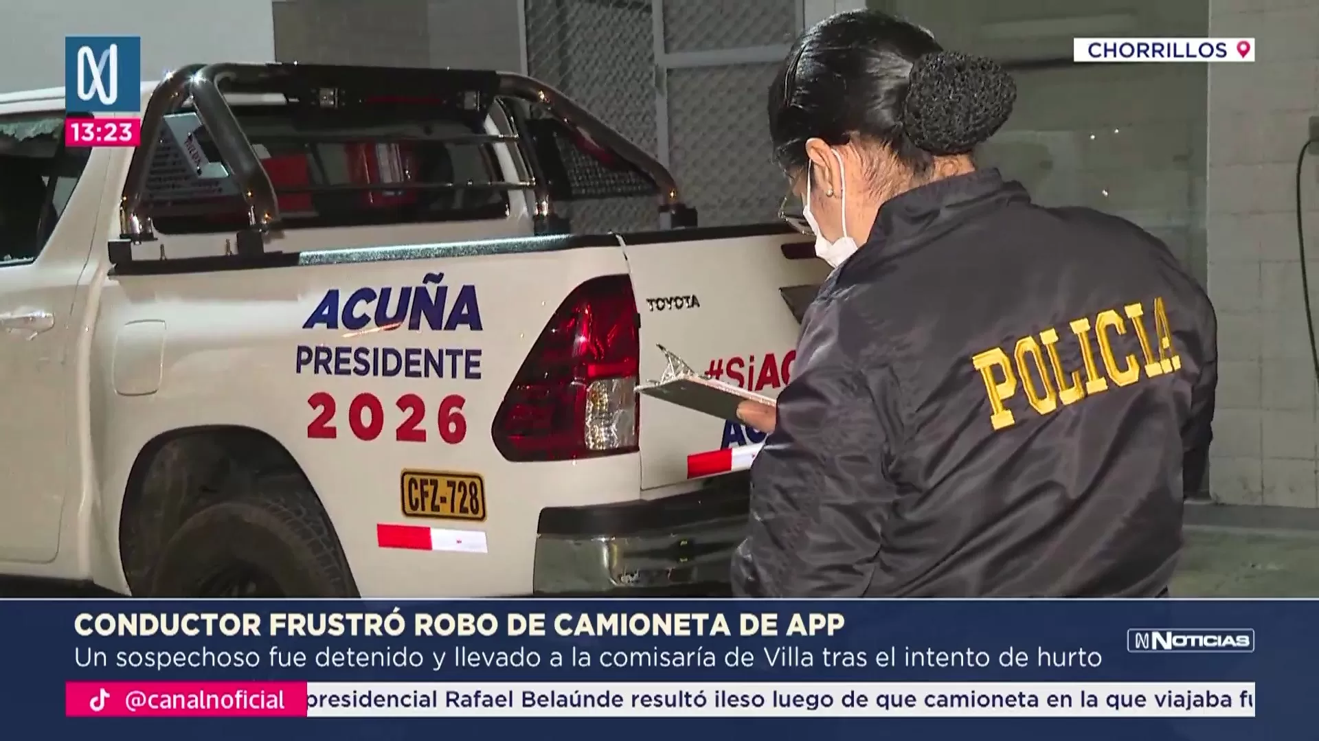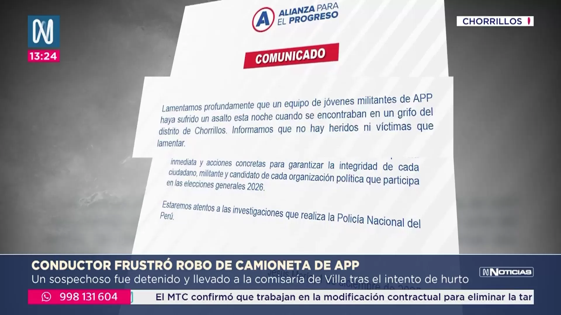 En Chorrillos, un conductor frustró un intento de robo a una camioneta del partido Alianza para el Progreso. Cinco sujetos lo interceptaron en un grifo y uno de ellos fue detenido tras un intercambio de disparos. El chofer, quien portaba un arma con autorización, repelió el ataque. La Fiscalía de Lima Sur investiga el caso. No se reportaron heridos. El detenido fue trasladado a la comisaría de Villa. APP emitió un comunicado confirmando que no hubo víctimas entre sus militantes. Las autoridades analizan cámaras de seguridad para identificar al resto de los implicados en el intento de asalto.