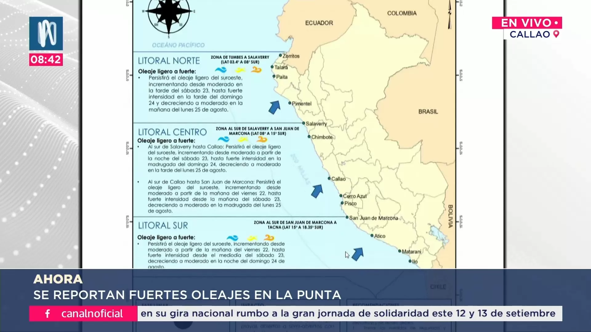 La Dirección de Hidrografía y Navegación de la Marina viene evaluando la evolución del oleaje anómalo mediante sus sistemas de monitoreo oceanográfico. El aviso Nº 38 establece una vigencia hasta el 27 de agosto, fecha tras la cual se emitirá una nueva evaluación. Por su parte, la Dicapi coordina el cierre y reapertura progresiva de los puertos, de acuerdo con las condiciones meteorológicas.