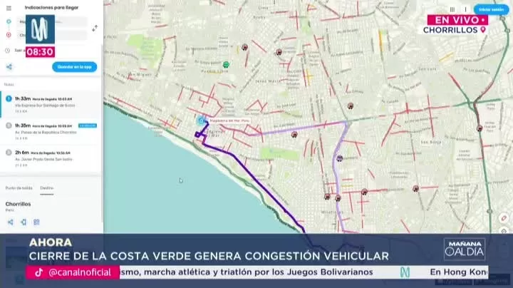 Este jueves, el cierre temporal de la Costa Verde por la competencia de ciclismo de los Juegos Bolivarianos provocó una intensa congestión vehicular en distritos como Chorrillos, Barranco, Miraflores, San Miguel y Magdalena. La competencia se desarrolla hasta la 1 de la tarde, y la vía será reabierta completamente recién a las 4 p.m., según indicaron las autoridades.