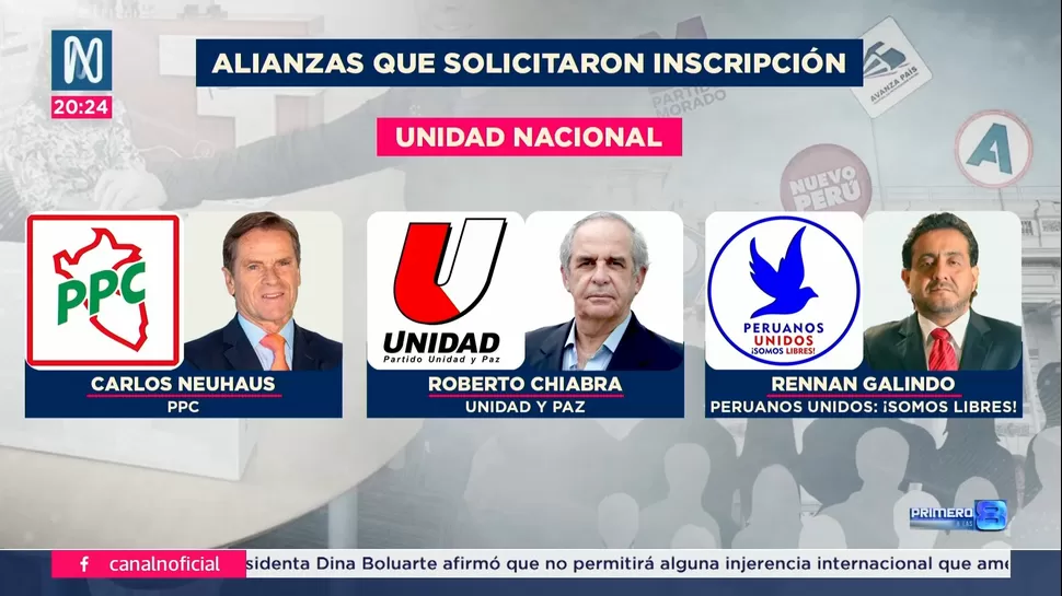 La alianza denominada Unidad Nacional está conformada por el Partido Popular Cristiano (PPC), representado por Carlos Neuhaus; el Partido Unidad y Paz, cuyo eventual candidato presidencial sería el congresista en retiro Roberto Chiabra; y el partido Peruanos Unidos Somos Libres, que tiene como representante visible a Rennán Galindo. Este último partido fue fundado por el fiscal supremo Tomás Aladino Galvez, quien renunció a su liderazgo al reincorporarse a la Fiscalía.