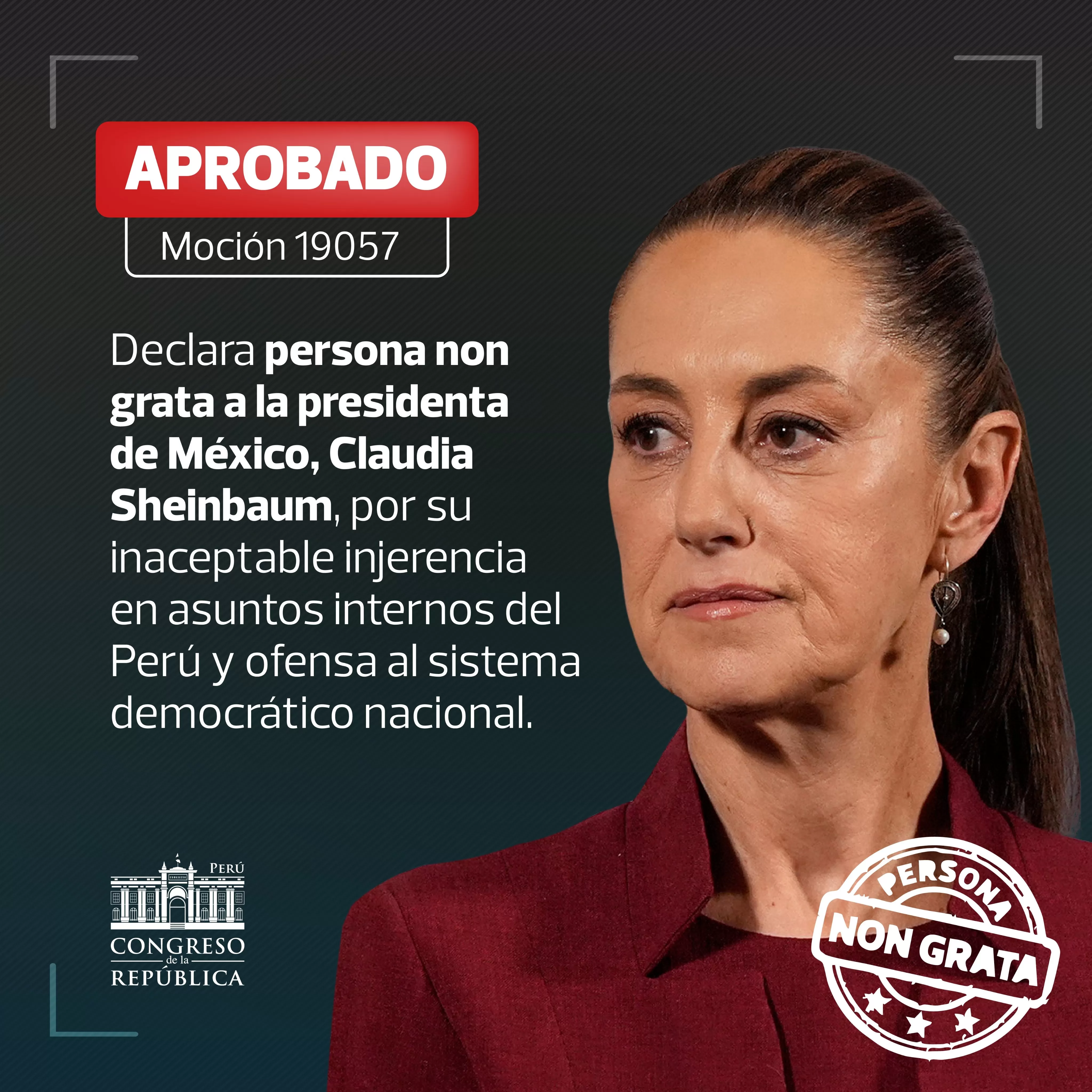 El pleno del Congreso aprobó con 63 votos a favor, 34 en contra y 2 abstenciones una moción que declara como persona no grata a la presidenta de México, Claudia Sheinbaum, debido a su inaceptable injerencia en asuntos internos del Perú y una ofensa al sistema democrático nacional.