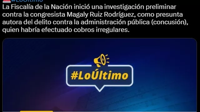 La Fiscalía de la Nación inició una investigación preliminar contra la congresista Magaly Ruiz Rodríguez, como presunta autora del delito contra la administración pública, en la modalidad de concusión, al haber efectuado cobros irregulares.