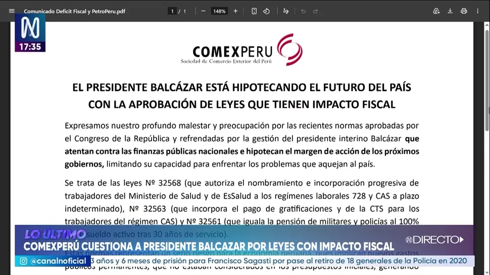 El gremio ComexPerú expresó su preocupación por las recientes normas aprobadas por el Congreso de la República y promulgadas por el presidente José María Balcázar, señalando que estas generan un impacto directo en las finanzas públicas del país. Según el comunicado, las medidas implican gastos permanentes no previstos en el presupuesto inicial.