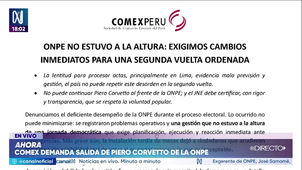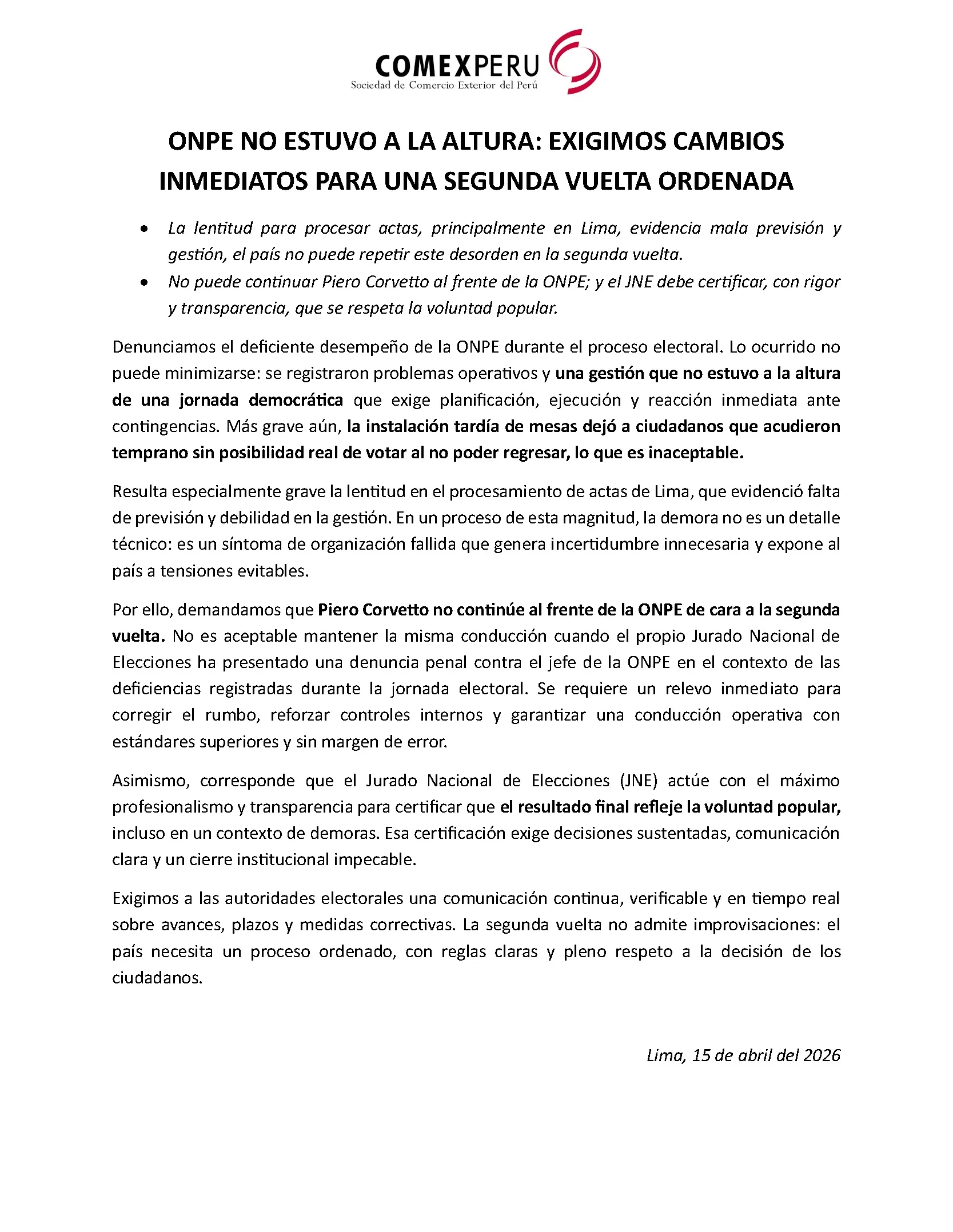 Ante este panorama, ComexPerú demanda que el señor Piero Corvetto no continúe al frente de la ONPE de cara a la Segunda Vuelta. Argumentan que el propio Jurado Nacional de Elecciones (JNE) ha presentado una denuncia penal contra el jefe del organismo electoral en el contexto de las deficiencias registradas. Por ello, consideran que es indispensable un relevo inmediato para corregir el rumbo, reforzar los controles internos y garantizar una conducción operativa con estándares superiores y sin margen de error.