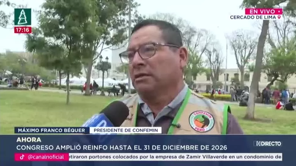 El dirigente de la Confederación Nacional de Mineros Artesanales y Pequeños Productores Mineros del Perú (CONFEMIN), Máximo Franco Béquer, se pronunció tras la primera votación en el Congreso que aprobó, con 60 votos a favor, la ampliación por un año más del Registro Integral de Formalización Minera (Reinfo).