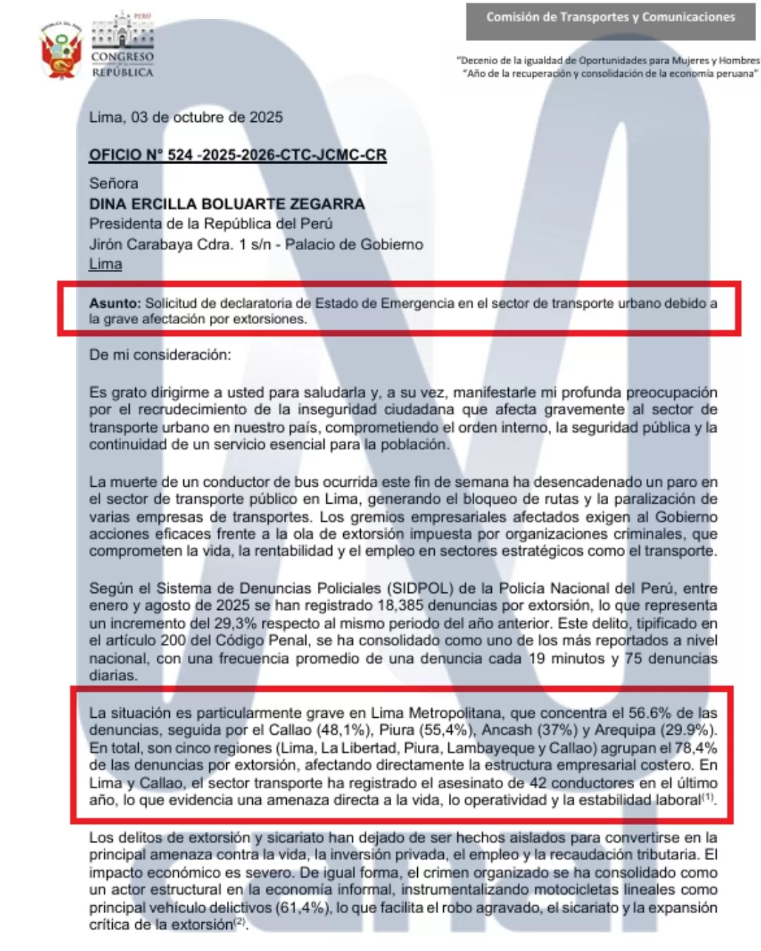 En su escrito, Mori destaca que estos delitos no se limitan a amenazas, sino que incluyen agresiones físicas, incendios de unidades y cobros ilegales. Por este motivo, considera que el estado de emergencia permitiría una reacción coordinada entre el Ejecutivo y las fuerzas del orden.