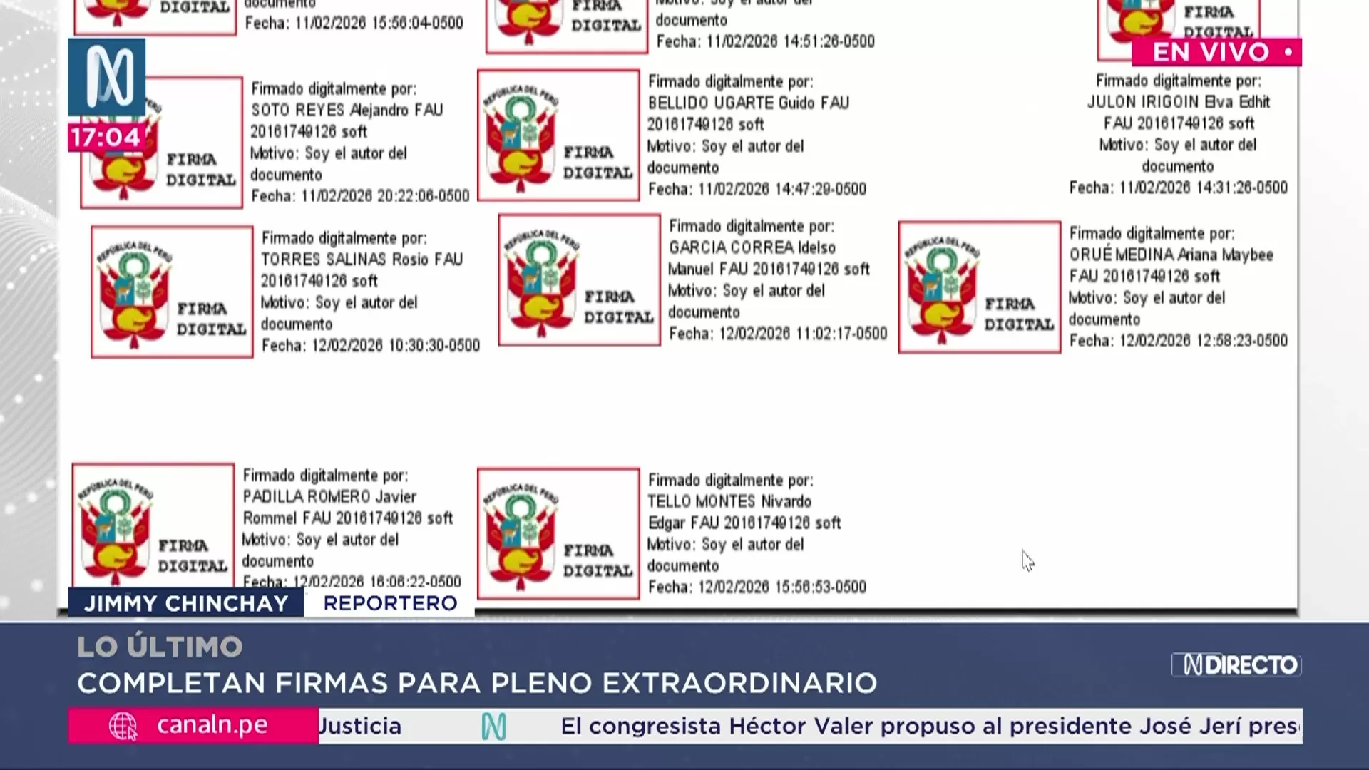 El Congreso reunió 78 firmas para solicitar un pleno extraordinario donde se debatirán mociones de censura y vacancia contra José Jerí. El documento será enviado a Oficialía Mayor y luego al presidente del Congreso, Fernando Rospigliosi, quien tiene 15 días para convocar. Del 1 al 10 de febrero se obtuvieron 63 firmas de diversas bancadas. El 12 de febrero se sumaron nuevas adhesiones que completaron el mínimo requerido. APP y Podemos confirmaron su respaldo. Las mociones están vinculadas a reuniones extraoficiales con empresarios chinos y serán discutidas en sesión plenaria.