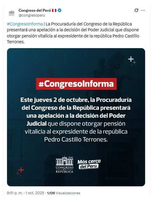 La Procuraduría del Congreso de la República anunció que este jueves 2 de octubre presentará un recurso de apelación contra la resolución judicial que ordena otorgar pensión vitalicia a Pedro Castillo. La medida fue comunicada mediante una publicación oficial en las redes del Legislativo, en respuesta a la sentencia emitida por el Segundo Juzgado Constitucional Transitorio de Lima.