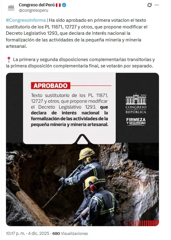Previo a la votación, el presidente de la Comisión de Energía y Minas, Víctor Cutipa Ccama, señaló que la norma busca evitar impactos negativos laborales, ambientales y económicos en los mineros que iniciaron su proceso de formalización.