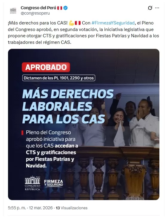 El Congreso de la República aprobó en segunda votación una ley que reconoce gratificaciones y Compensación por Tiempo de Servicios para los trabajadores CAS del sector público. La decisión fue adoptada el 12 de marzo con 86 votos a favor, sin votos en contra ni abstenciones. La iniciativa ya había sido aprobada en primera votación el 17 de septiembre de 2025 con 84 votos a favor, dos en contra y una abstención. El dictamen modifica los artículos 3, 5 y 6 del Decreto Legislativo 1057. La norma establece gratificaciones equivalentes a una remuneración mensual en julio y diciembre y una CTS calculada sobre el 100% del sueldo anual.