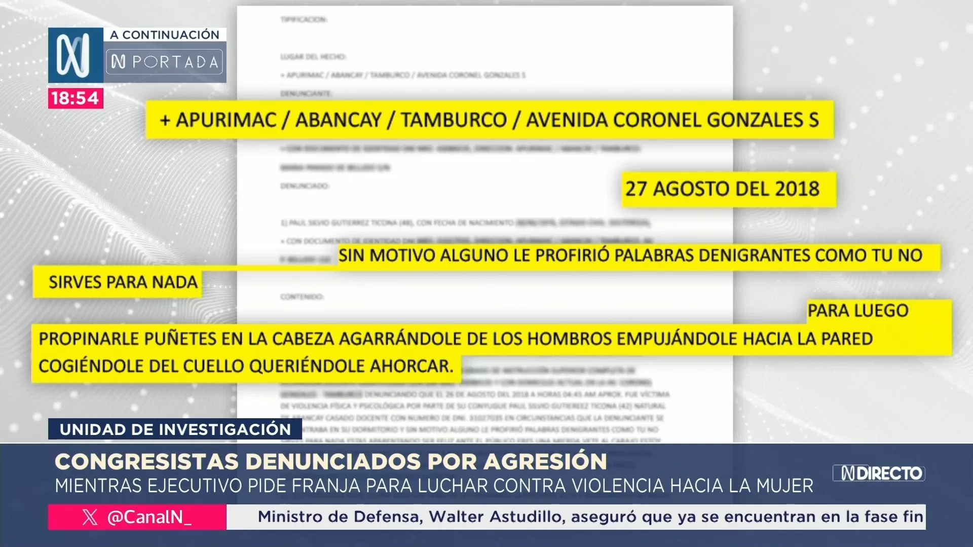 “La denunciante declaró que Alva Rojas la empujó y le propinó un puñete en el pómulo izquierdo y en el hombro, donde tiene una operación en el seno. Pese a ello, el congresista continuó golpeándola.”