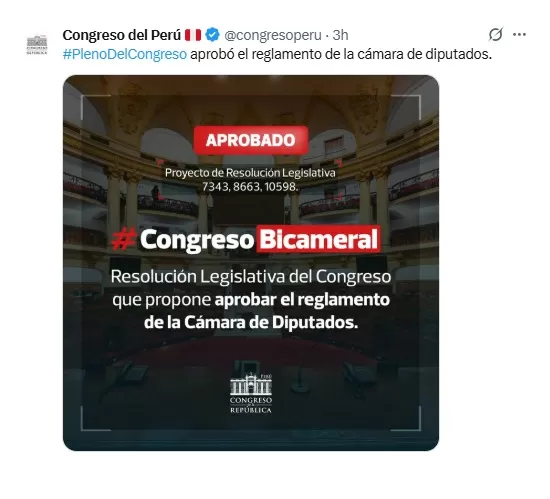 El Congreso bicameral sigue avanzando hacia su implementación tras la aprobación de los reglamentos que regirán al Parlamento, la Cámara de Diputados y la Cámara de Senadores a partir del año 2026. El Pleno del Legislativo aprobó los tres textos normativos por mayoría en una sesión realizada este jueves.