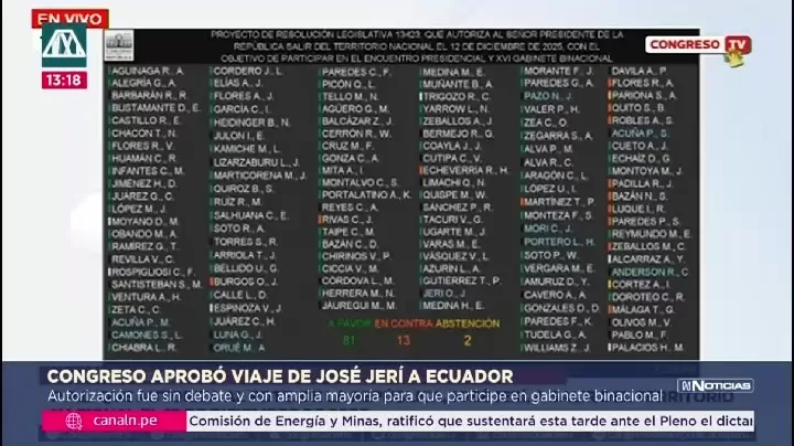 El Congreso de la República autorizó este jueves el viaje del presidente José Jerí a Ecuador para participar en el Gabinete Binacional que se realizará el 12 de diciembre. La resolución fue aprobada por mayoría, sin debate en el Pleno.