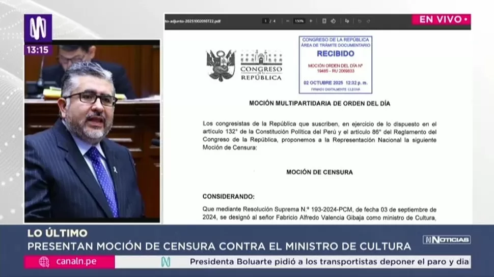 El Congreso de la República recibió una moción multipartidaria que propone censurar al ministro de Cultura, Fabricio Alfredo Valencia Gibaja.