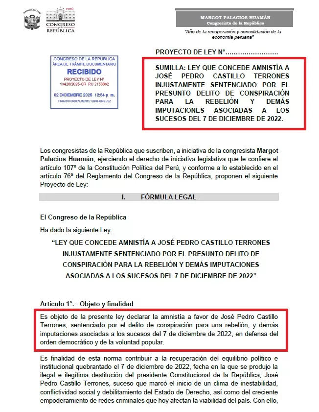 El proyecto presentado por Margot Palacios considera que la situación de Castillo debe ser tratada como un conflicto político y no como un proceso penal. Según el texto, la medida no genera gasto público, y se presenta como un paso necesario para cerrar una etapa de inestabilidad prolongada.